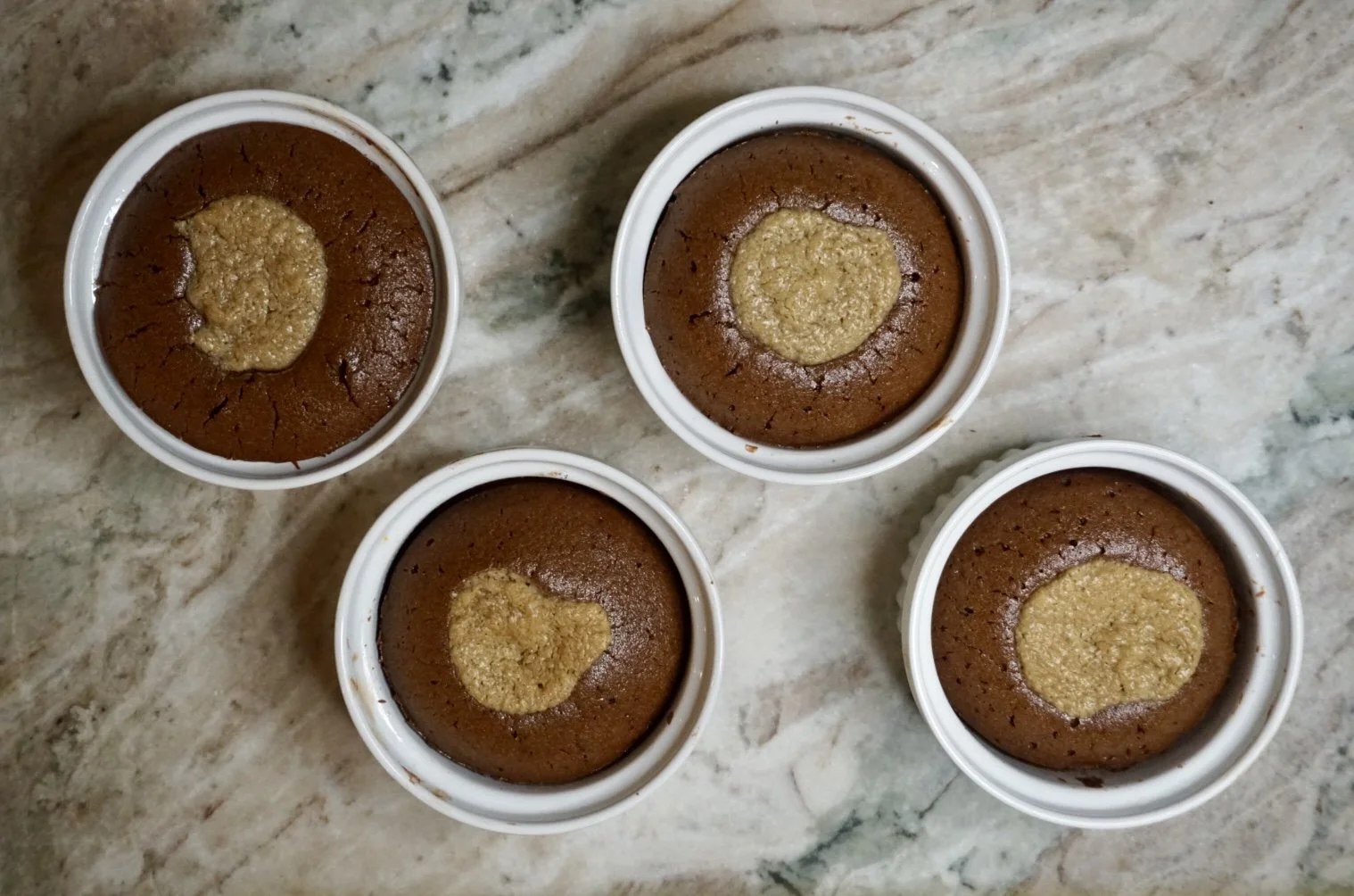 Divide the soufflé mixture into well-greased ramekins. Place a heaping spoonful of Maple Tahini in the middle of each soufflé.