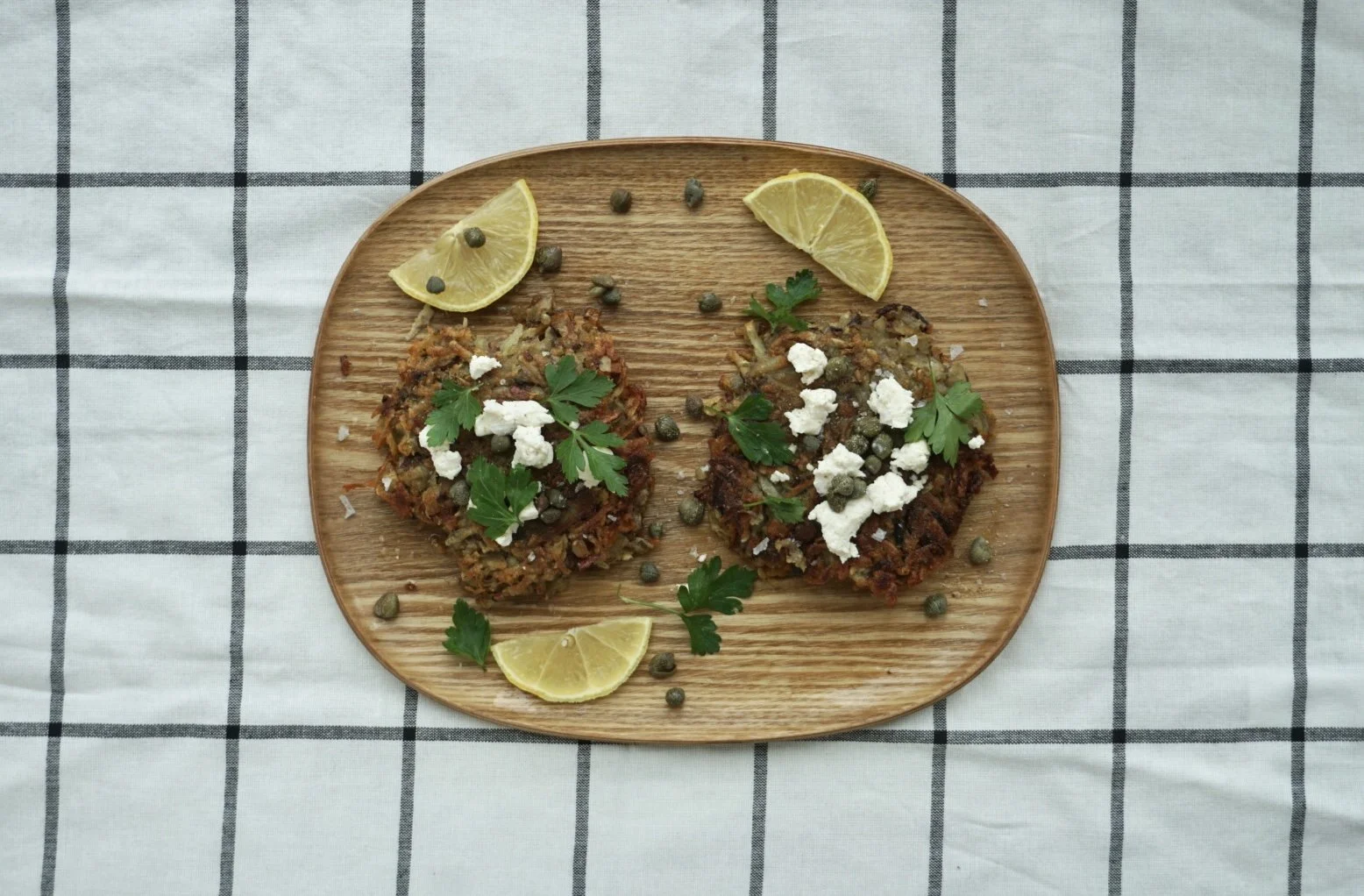Place the cooked pancakes on a serving plate and top with a little plant-based ricotta, more capers, parsley and flaky sea salt.