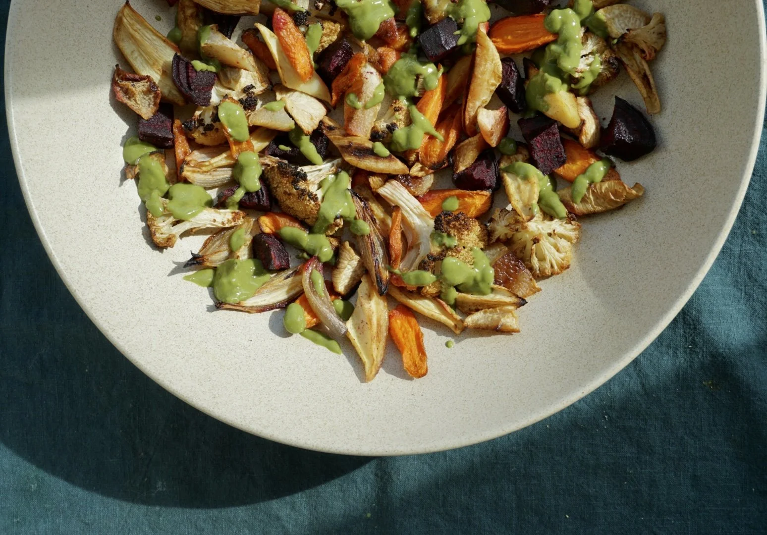 Roasted Winter Vegetables with Matcha Tahini Dressing