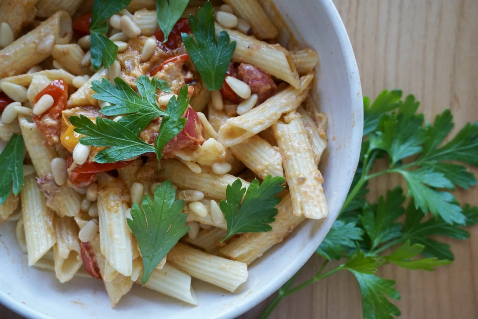 Toss the tomato tahini sauce into a bowl of pasta. Garnish with toasted pine nuts and fresh parsley.