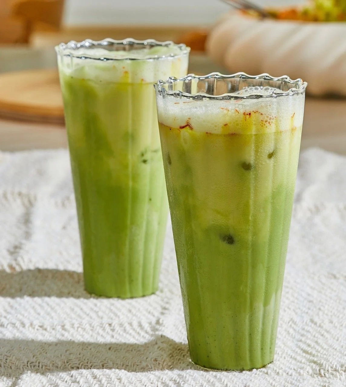 Pour the saffron water and pistachio milk into a small pitcher. Briskly whisk until well incorporated. Pour the saffron milk mixture into the iced matcha glass(es). Sprinkle a couple extra saffron threads on top.